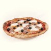 Pomodoro, mozzarella, prosciutto cotto, gorgonzola, olive nere